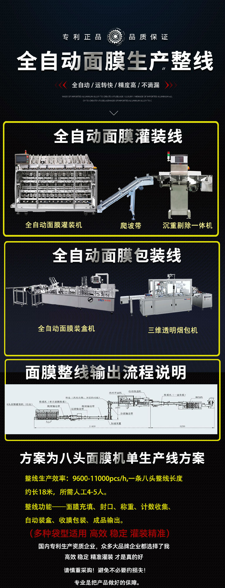 本產(chǎn)品是從事面膜產(chǎn)品的充填和封裝一體化的專(zhuān)業(yè)設(shè)備,具有衛(wèi)生,環(huán)保,高效,節(jié)省人力成本,占地面積小等特點(diǎn)。全觸摸屏+plc控制,動(dòng)作高效,迅速,簡(jiǎn)潔,四頭理論速度可以達(dá)到7200片/小時(shí),十頭更多