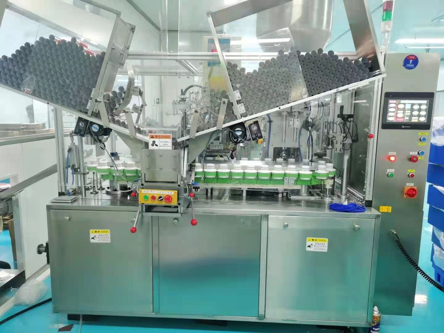 灌裝部分可升降,水冷管道可一按排水,灌裝容量調節簡易優化,機臺配件全面優化:自帶光眼標配三色,亞力克防塵防靜電安全房可視罩內,易觀察、易操作、易保養:40個軟管杯:一套平角切刀(不含軟管圓角切刀)等